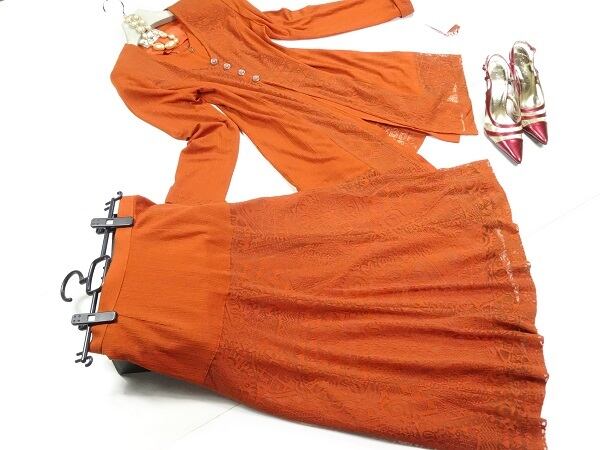 幾何学模様が印象的なロング丈の上下セットです。胸元には大きなボタンがアクセントに。パーティやイベントなど、様々なシーンで、気品のある印象を与えてくれる一枚です。裏地有。
