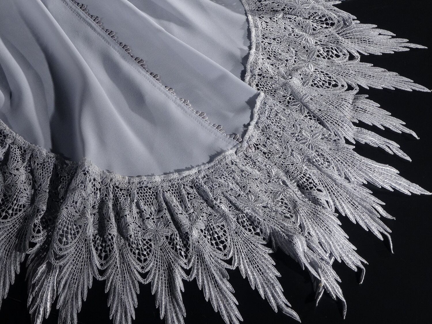 南国の葉をイメージしたような立体刺繍が豪華にあしらわれたボレロ。留め具なしの羽織るデザイン。グレーの色合いがシックでやさしくエレガントな一着です。