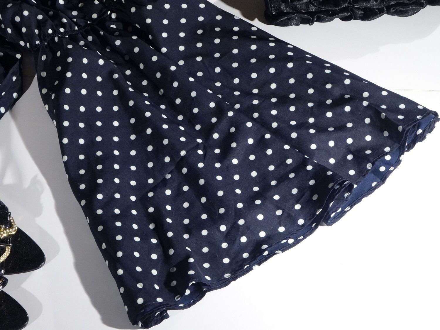 小さなドット柄が繊細で可愛い印象のワンピ-スです。水玉柄で可愛く着こなせます。スカ-トは広がりがありとてもフェミニンな一着です。前ボタン。スカ-ト部分のみ裏地有。