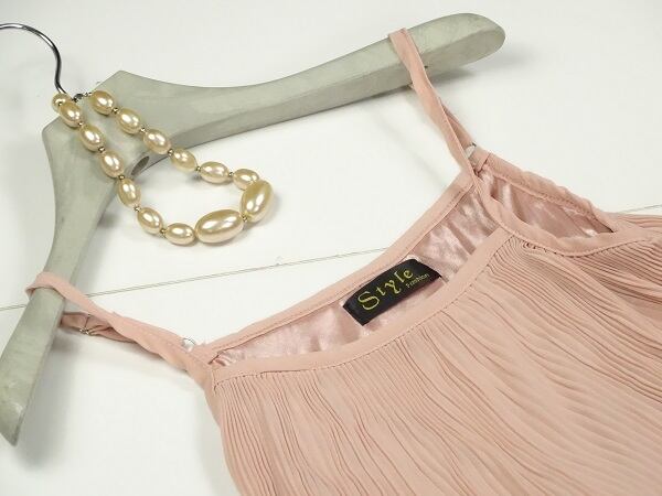 かわいいピンクカラーのコサージュ付キャミソールタイプのワンピース。トップス部分はプリーツがウエストまで下地にかぶさるデザイン。ウエストから下は繊細なプリーツ仕様で、途中からゆるやかなフレアに変化しています。女性らしい、動きを美しく魅せてくれる一着です。ファスナーなしのかぶるタイプ。花のコサージュ付。裏地あり。