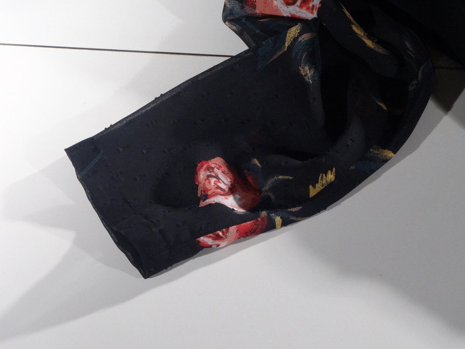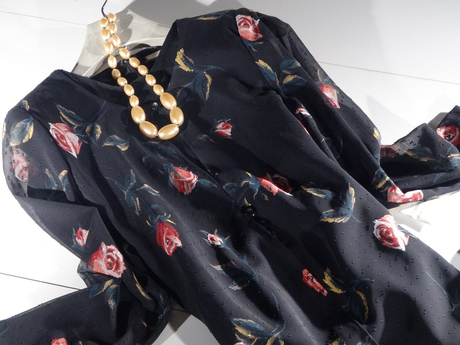 黒地に大きなバラモチーフがプリントされたシックなワンピース。インナーとアウターのセットアップ風にみえるデザインはユニークでおしゃれ。品の良い、パーティやお呼ばれ・・・と、どんなシーンにも映える素敵な一枚です。裏地付き。