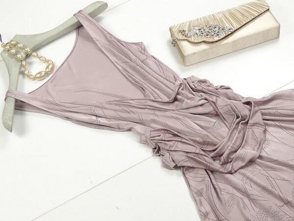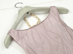 裏表に胸元にドレ-プが施されたシルエットのとても美しいワンピ-スです。胸元が深めに開いていますのでキャミソ-ルやインナ-は必要です。薄いサラサラとした生地で被るタイプです。裏地なし。