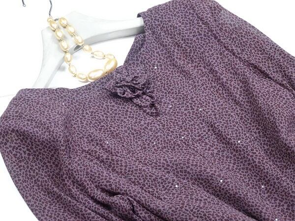 レオパード柄にブローチ飾りのワンピース。落ち着いたパープルの生地には、全体に、江戸小紋のように、小さなレオパード柄がプリントされています。胸元の太い幅のタックからウエスト、裾にかけてゆるやかなプリーツが広がり、優しくエレガントな印象に。胸元のブローチは取り外し可能なので、その時の気分で。品良い一着です。背中ファスナー。裏地あり。