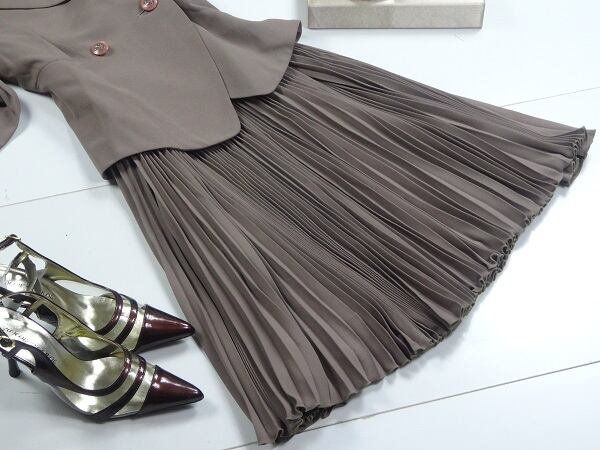 シックなフォーマルジャケットとプリーツスカートのセット。ジャケットはアクセントとして襟にチェーン状の刺繍をほどこし、フロント両脇にボタンをアクセントに。スカートは膝下丈で、繊細なプリーツが美しくシンプルでエレガントなライン。上品で優しい大人の女性を表現。フォーマルなシーンにかかせない一着です。 ジャケットはフロントボタン留め、肩パットつき。スカートはサイドゴム仕様、後ファスナー。裏地有り。