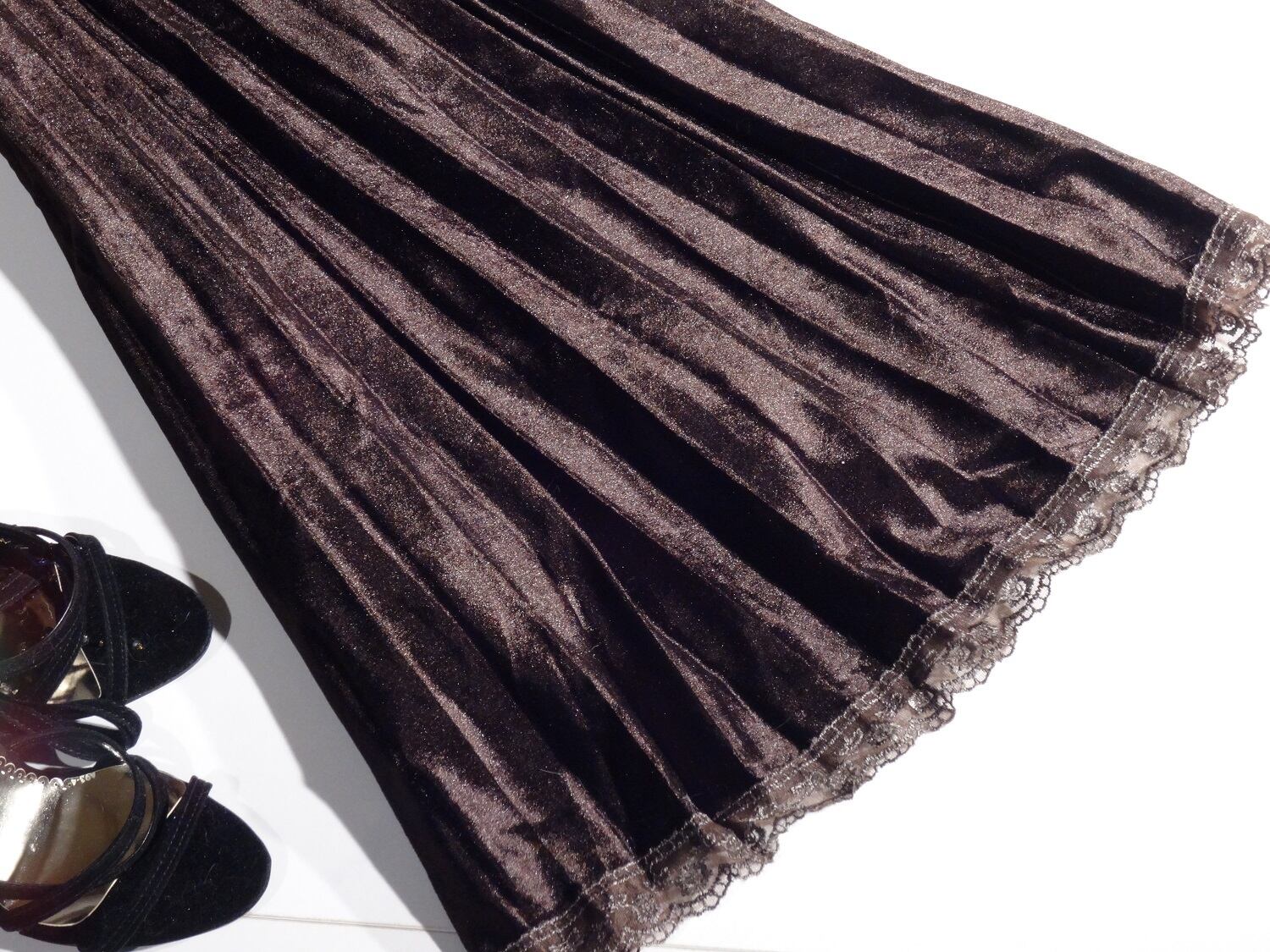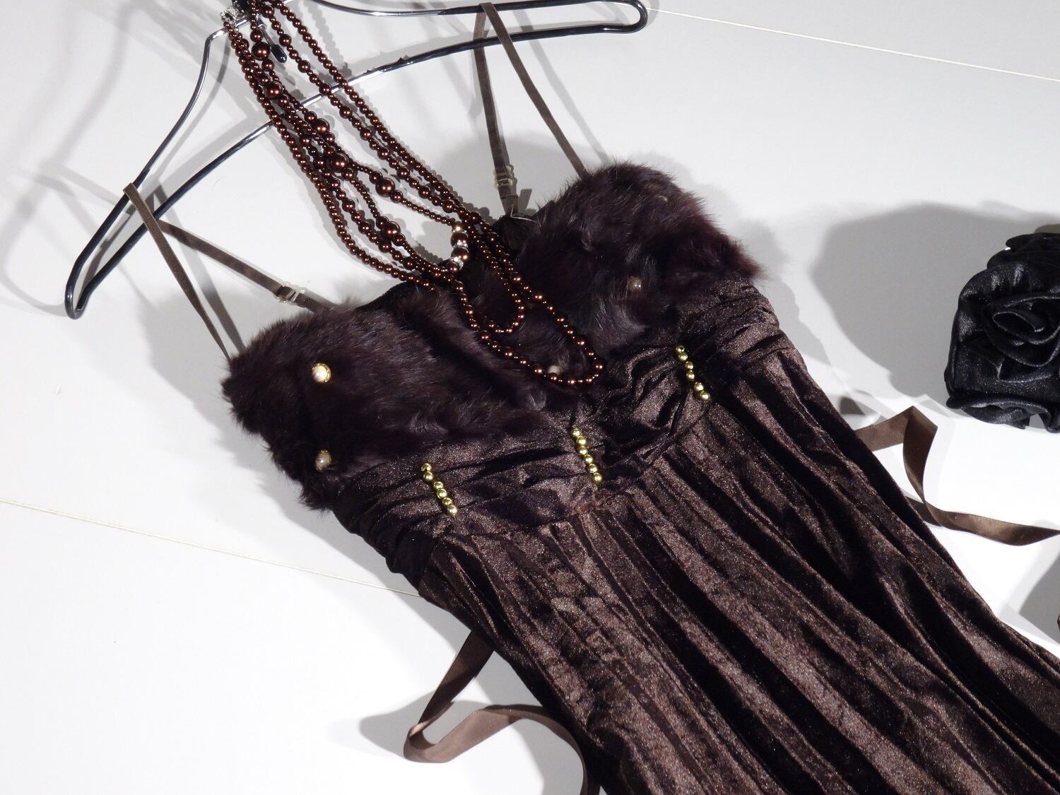 艶やかなブラウンのベロア生地。胸元のフワフワした人工ファーにかわいいフェイクパールと金の丸玉飾りがアクセントになっています。すそまでは1.5cmほどのプリーツ仕様。やさしくて可愛いデザイン。いろいろなコーディネートを楽しんで頂けます。裏地なし。