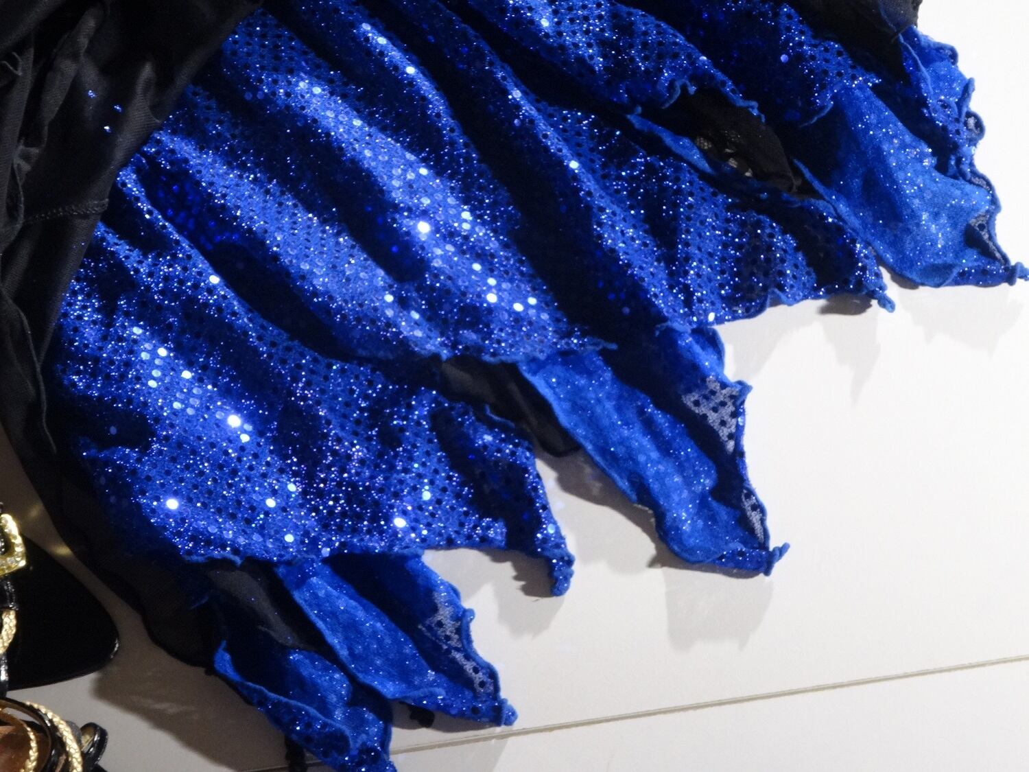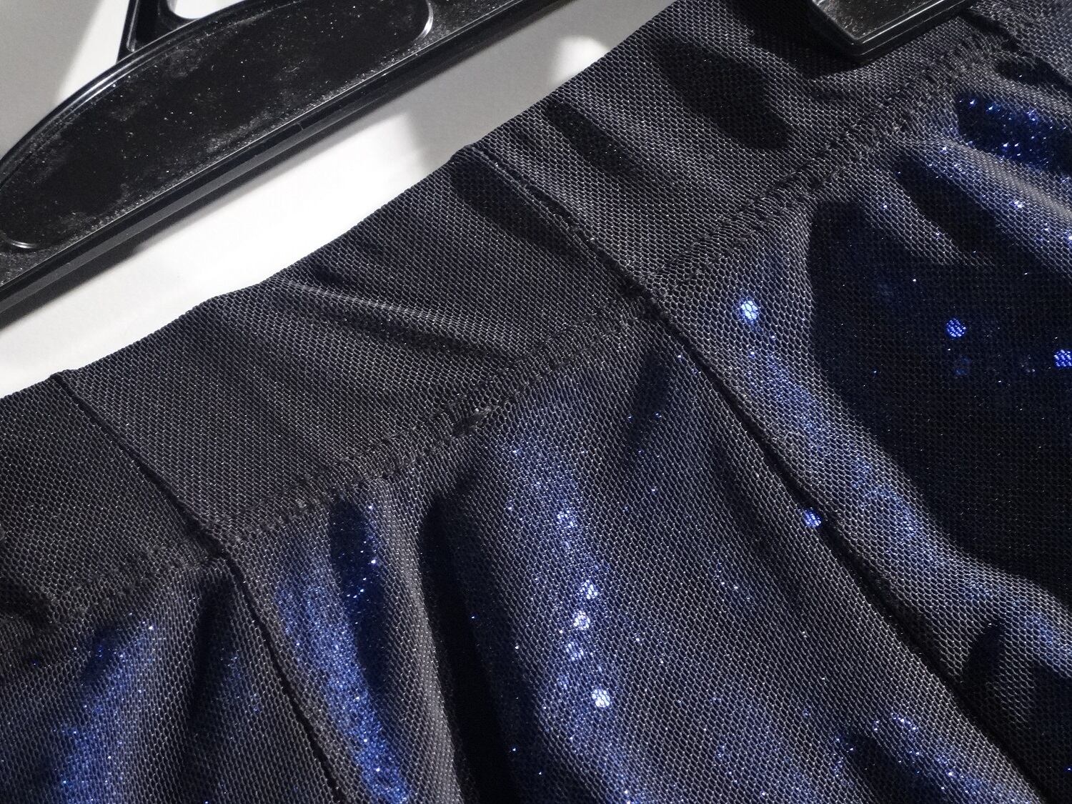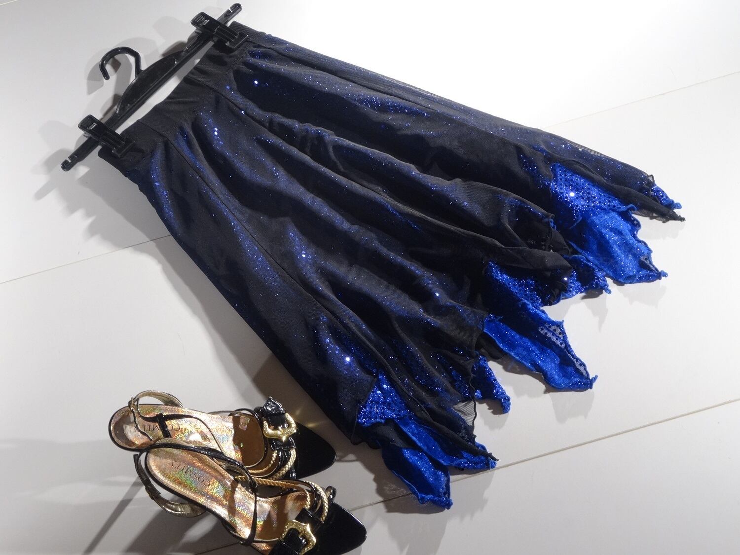 ベリーダンス用の黒のネット素材とブル-のスパンの重ねスカートです。踊りに合わせて光にきらめき、優雅でゴージャスな印象に。ウエストは総ゴム仕様で伸縮性有。