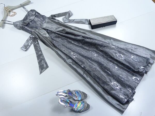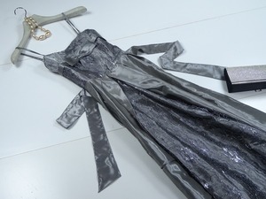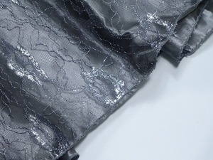 全体にシルバ-レ-スが施されとても高級感漂う上品でエレガントなロングドレスです。とても楽な着心地で着ていてとても軽いドレスです。いろいろな場面で人目を引くでしょう。裏地有り。ファスナ-有。肩紐調整可。