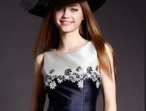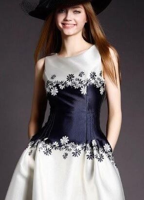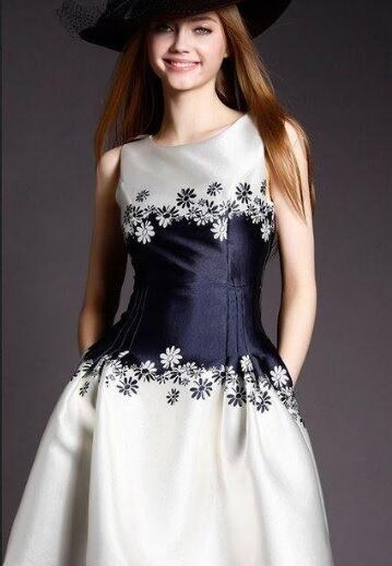 白色と紺色の花柄プリントがとても美しいワンピースです。花模様が全体を綺麗なバランスにまとめています。背中ファスナー有。裏地なし。