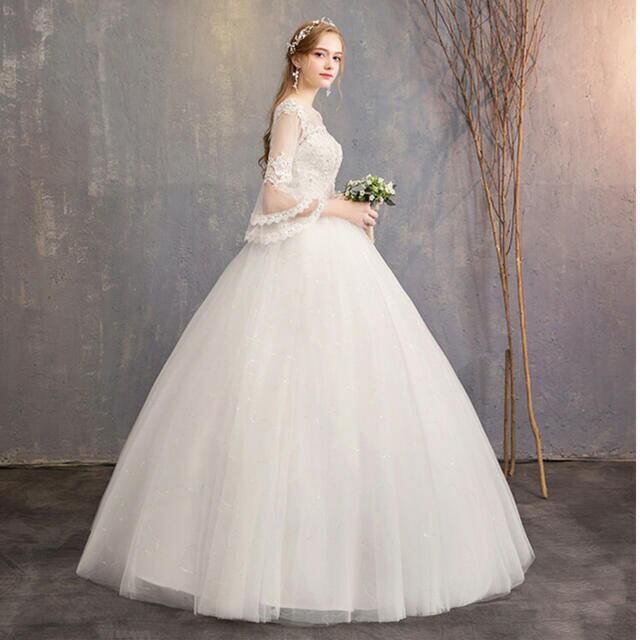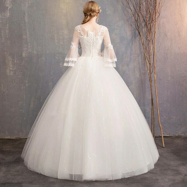 刺繍&スパンコ-ル飾りプリンセスウエディングドレスです。トップス部分は刺繍とスパンコ-ルがたくさん飾られキラキラ輝きとてもエレガントで豪華です。胸元からウエスト下にかけて綺麗なAラインに広がり豪華かつエレガントな雰囲気を醸し出しています。ウエディングドレスとしても、また、パーティやイベント、結婚式など、様々なシーンで、気品のある印象を与えてくれる一枚です。裏地付き。背中腰から下ファスナ-有。(背中編上げで結び紐有り)。胸パット付。背中編上げなので2~3cmのバストサイズの幅は結び具合により大丈夫です。