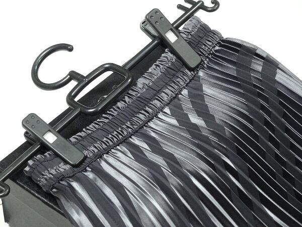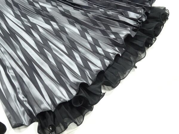 光沢斜めライン入りプリ-ツスカ-ト。光のあるシルバーグレーの生地に斜めに黒のラインが入り、裾は黒のシフォンが少し見えるデザイン。ウエストは総ゴムでサイズ的にゆったり着用頂けます。動くたびに揺れエレガントで光沢感がお洒落。女子力UP間違いなしとおもいます。ファスナ-なし。裏地あり。