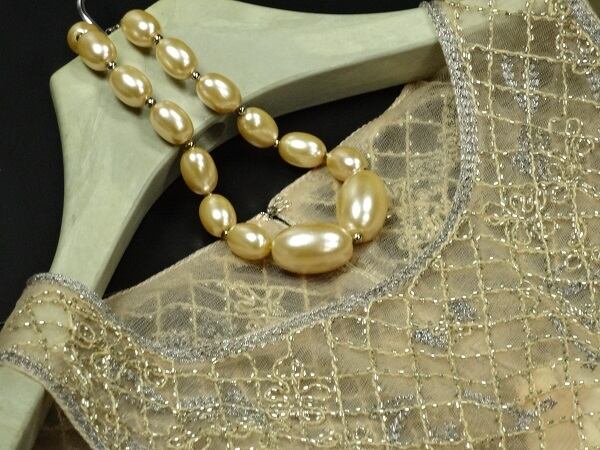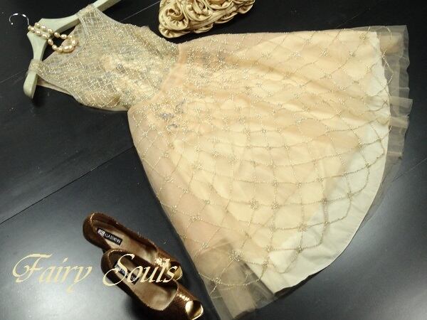 透け感が美しいビーズ使いのドレスワンピ-ス。落ち着いた淡いオレンジカラーのチュール地にビーズをふんだんにあしらいボリュームを出した華やかなデザイン。胸元などほんのり透け感があり、品の良いセクシー感をかもしだしています。シックでやさしくエレガントな一着です。背中ファスナーあり。裏地付き。ウエストベルト付き。