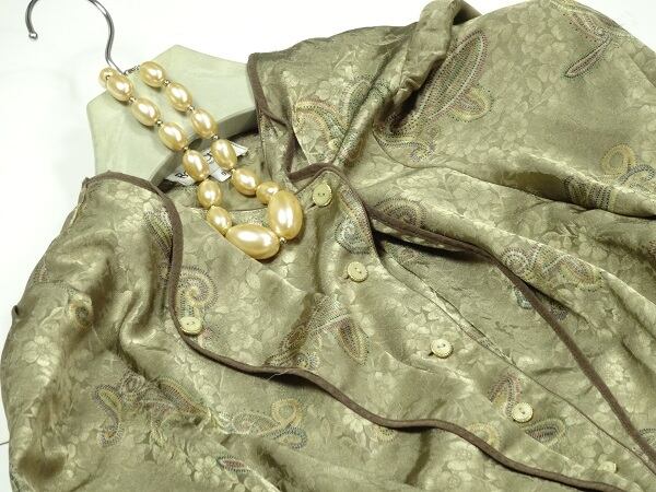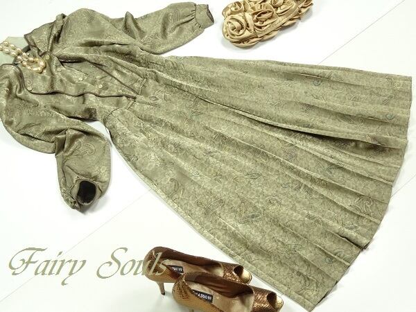 シックなジャガード織風長袖ワンピ-ス。落ち着いたサンドブラウンにクラシカルなプリントをあしらったシックでやさしくエレガントな一着。胸元は前ボタン留め。ウエストから下18cmほどファスナーがついていて着脱が楽です。すそまではプリーツ仕様でクラシカルな印象に。エレガントで品の良いデザインです。前ボタン留め。ウエスト下ファスナーあり。裏地付き。