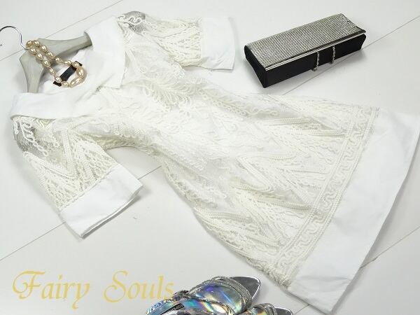 ピュアな白のメッシュ時にコットン糸で立体刺繍をほどこしたワンピース。襟元には同色のリボン。袖ぐりと裾には襟と同じく白の幅広の縁取りでデザインされています。清楚で品の良い仕立ての一着です。左脇ファスナー。裏地あり。