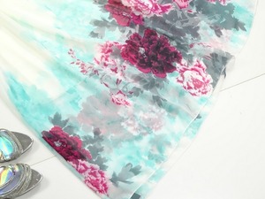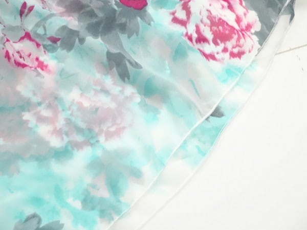 花柄プリントシフォンワンピ-スです。夏らしい明るい色の組み合わせで着心地抜群な素材でパ-ティ-はもちろんちょっとしたお出かけにもお役に立てる一着です。かぶるタイプです。裏地付。