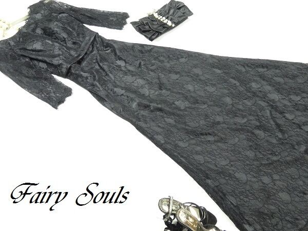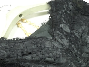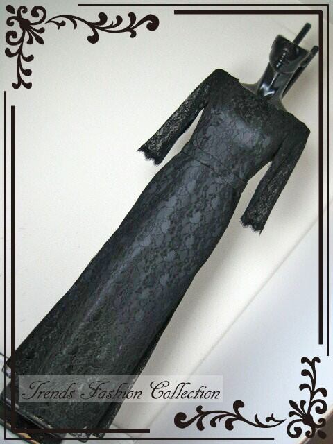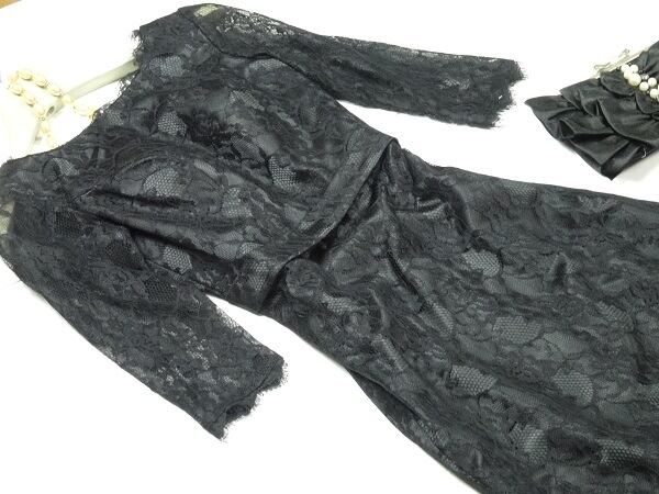 半袖総レース仕様ロング丈のワンピ-ス。シックな黒のレース地に花柄を配し、エレガントで品の良い印象に。背中側は浅いVの字にカットされ品の良いセクシー感を醸し出しています。シックでやさしくエレガントな一着です。背中ファスナーあり。裏地は表地のレースと縫い合わせて一つになっています。胸パット付き。