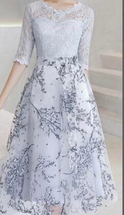 花柄チュ-ルレース仕立てパ-ティ-ドレスです。トレンド感たっぷり色の美しいエレガントなミディアムドレスです。ハイウエストのリボン切替で脚長効果のあるデザイン性のあるスタイルがとても魅力的な一着です。全体的に女性度UPに仕上げられています。背中ファスナ-有。胸パット付き。
