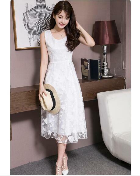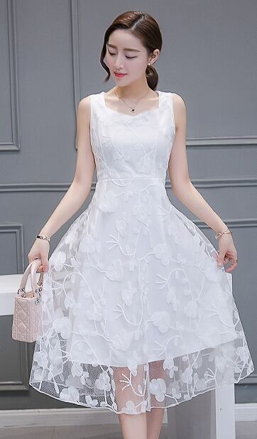 花模様のレース仕立てマキシ丈のワンピース。白の下地の上に、大きな花と葉を白糸で刺繍したレースをかぶせていて、薄い透け感がやわらかな印象を与えてくれています。大きなラウンドネックにノースリーブも全体の中でバランスが良く、ピュアでフェアリーなデザインになっています。煌めく太陽の光の中でも、また新緑の爽やかな風の中でも、着る人を美しく魅せてくれる一着です。透け感があるのでインナー着用をお勧めします。背中ファスナー。