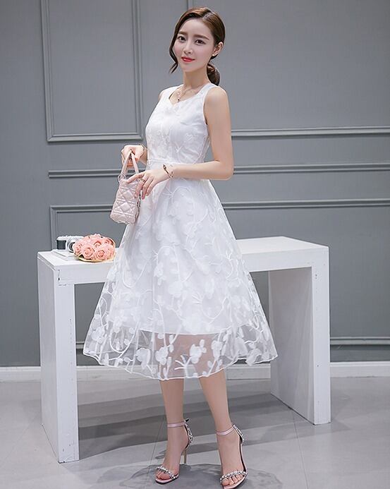 花模様のレース仕立てマキシ丈のワンピース。白の下地の上に、大きな花と葉を白糸で刺繍したレースをかぶせていて、薄い透け感がやわらかな印象を与えてくれています。大きなラウンドネックにノースリーブも全体の中でバランスが良く、ピュアでフェアリーなデザインになっています。煌めく太陽の光の中でも、また新緑の爽やかな風の中でも、着る人を美しく魅せてくれる一着です。透け感があるのでインナー着用をお勧めします。背中ファスナー。
