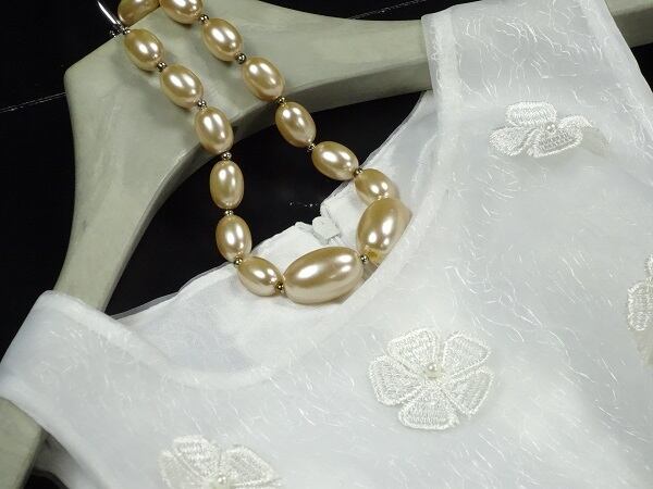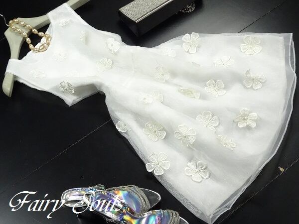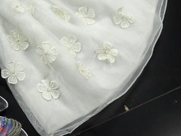 花模様の立体レース仕立て膝丈のワンピース。白の下地の上に、大きな花を白糸で刺繍したレースをかぶせていて、薄い透け感がやわらかな印象を与えてくれています。大きなラウンドネックにノースリーブも全体の中でバランスが良く、ピュアでフェアリーなデザインになっています。煌めく太陽の光の中でも、また新緑の爽やかな風の中でも、着る人を美しく魅せてくれる一着です。裏地あり。背中ファスナー。
