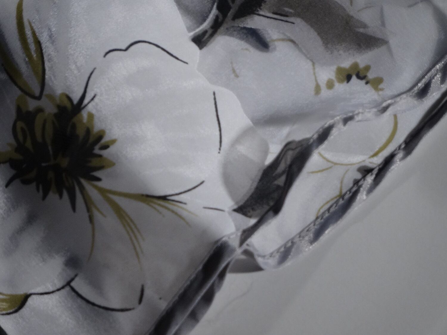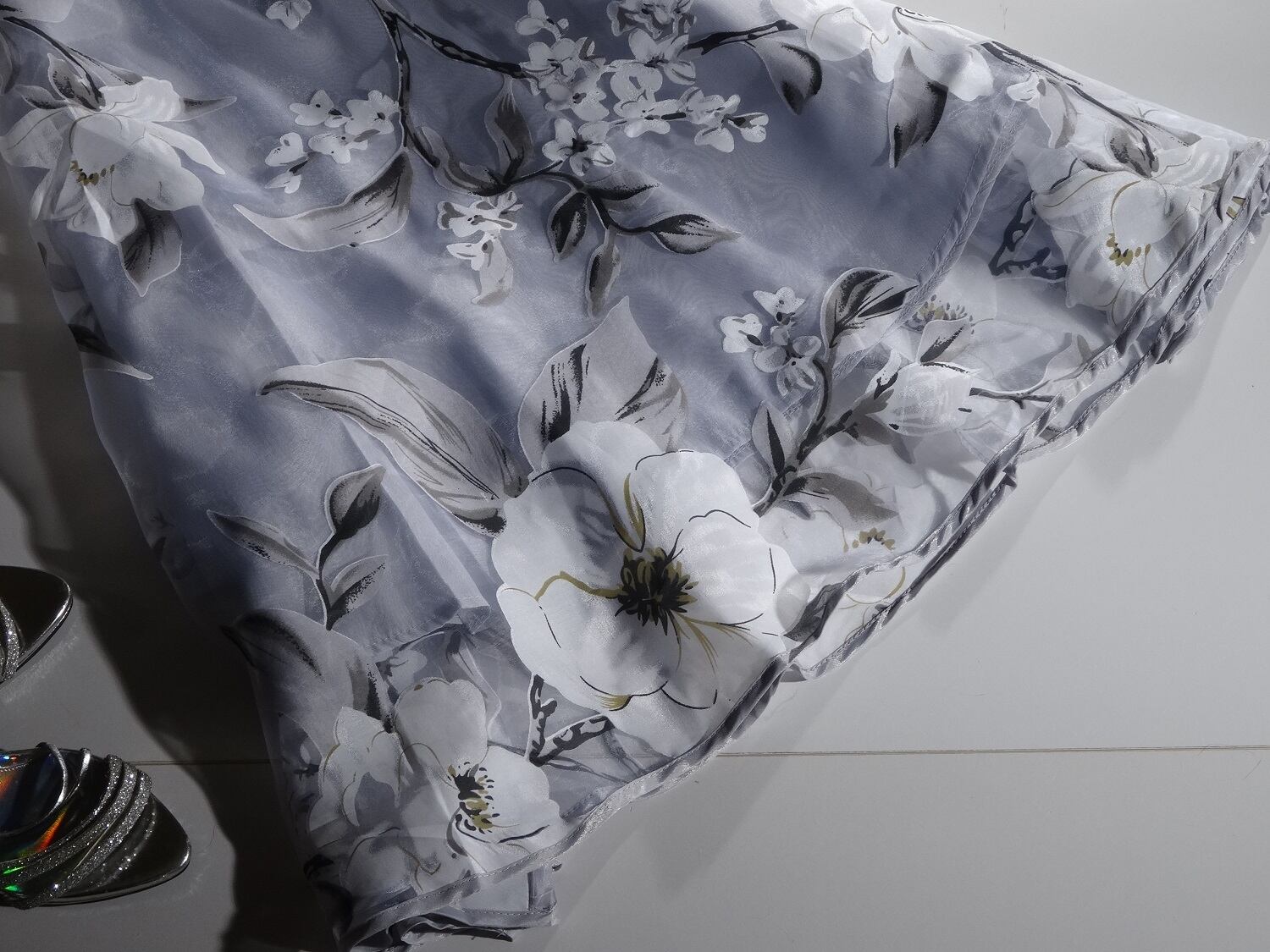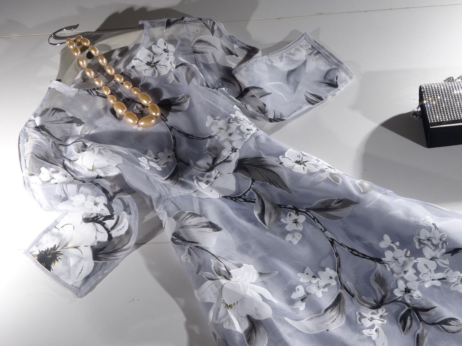 シックなオーガンジーのワンピース。落ち着いたグレーの地にモノトーンの花模様がバランスよくプリントされています。デコルテライン、袖のほんのり肌見せ透け感がエレガントで魅力的な一着です。結婚式や謝恩会などに。背中ファスナー有。ベルト付。裏地あり。