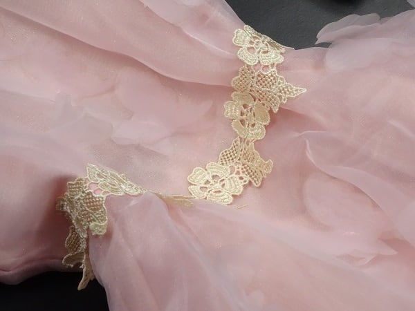 艶やかなオーガンジーがたっぷりと使用された膝丈のミニドレス。同じオーガンジーの蝶のモチーフがいっぱいあしらわれているフェアリーなデザイン。胸元、袖口、ウエストには繊細な模様のレース仕様になっていて、オーガンジーとレースの異素材の組み合わせが絶妙なハーモニーを作り出しています。品が良く、可愛い印象を与えてくれる一着です。左脇ファスナー。裏地あり。