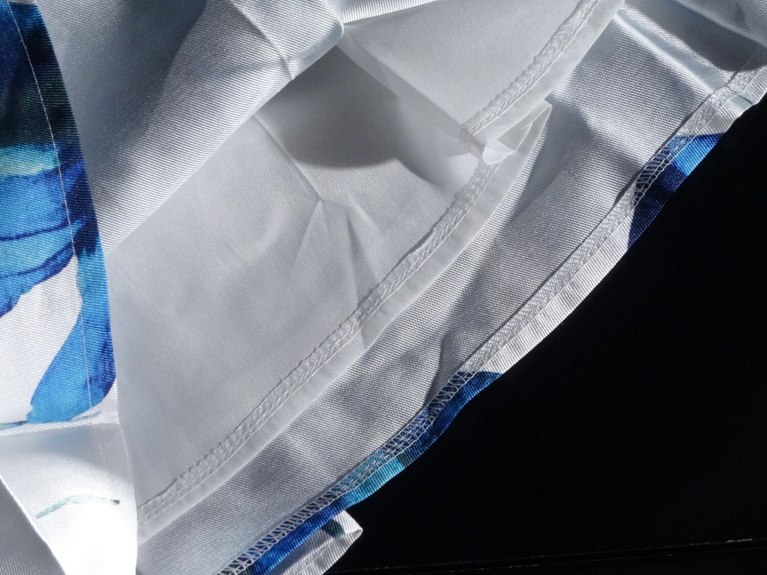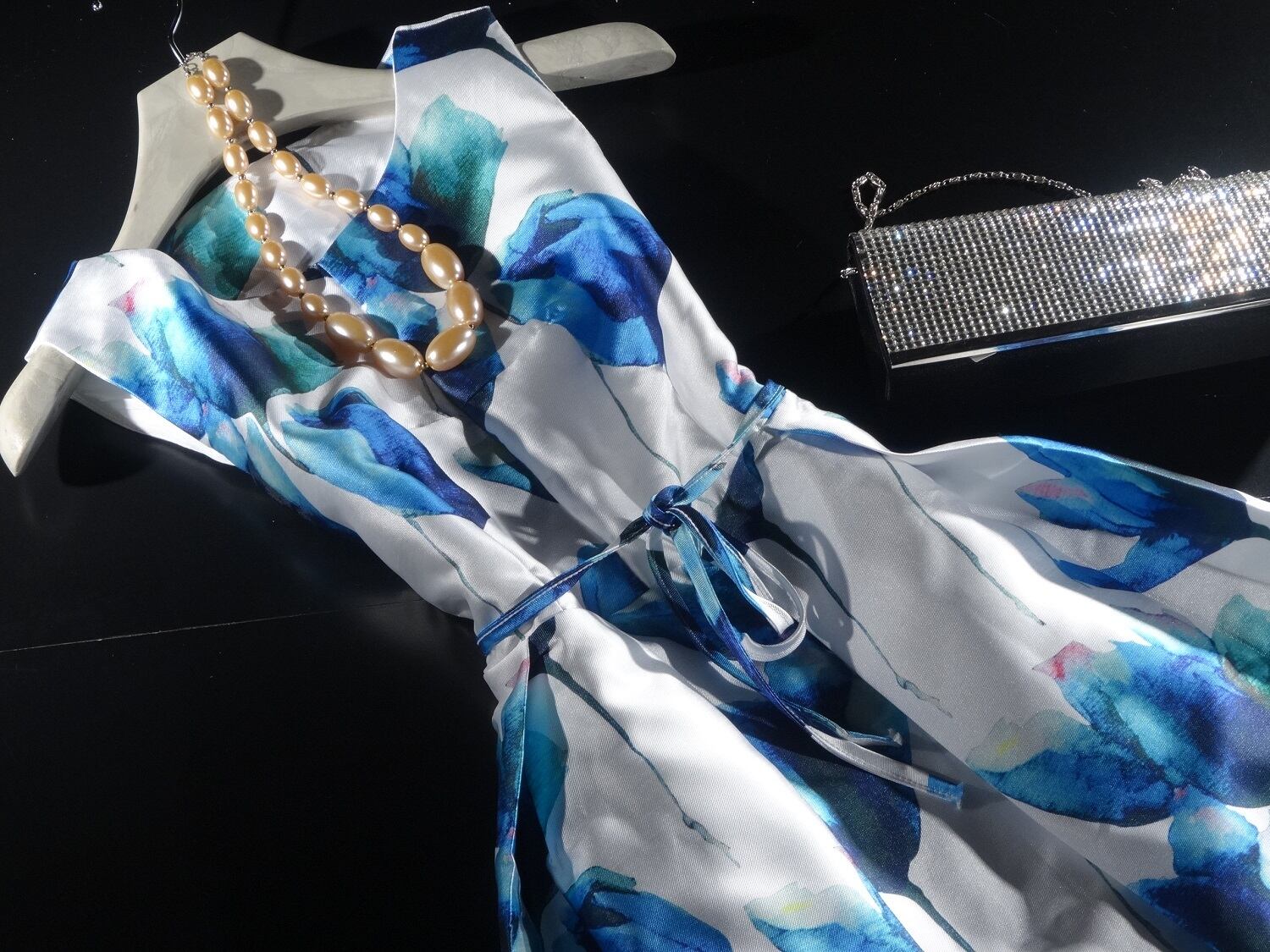 涼しいブル-色の花柄が綺麗で優雅な女性らしさが香る華やぎの一着です。背中は紐で調整出来ます。裏地あり。脇下ファスナ-有。