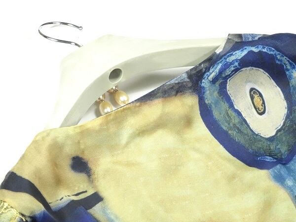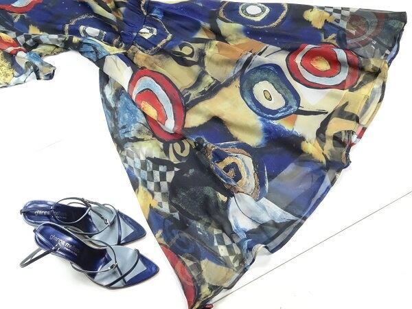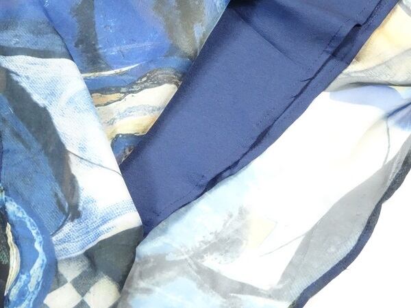 プリント着痩せシフォン膝丈ワンピースです。さらさらとした生地全体にブル-系を中心にパステル画のような模様がプリントされています。袖にレースが施され可愛らしさをアップ。ファスナーなしのかぶるタイプ。裏地付。