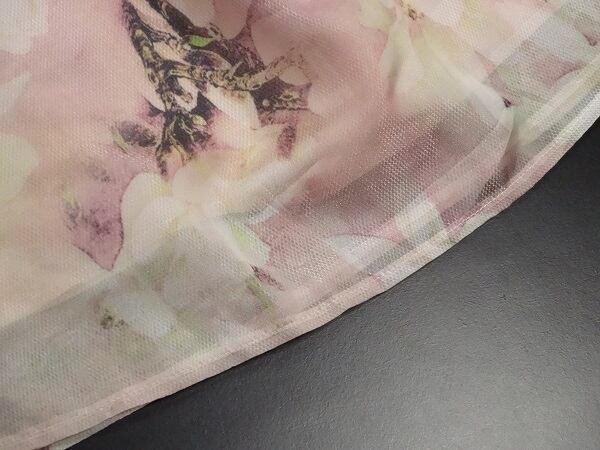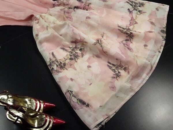 上質で花柄切替ふんわりノ-スリ-ブワンピース。全体がさらさらとした生地でトップス部分はピンクの無地でウエスト部分から花模様がプリントされています。ノースリ-ブがセクシ-度アップ。背中ファスナーあり。裏地付。