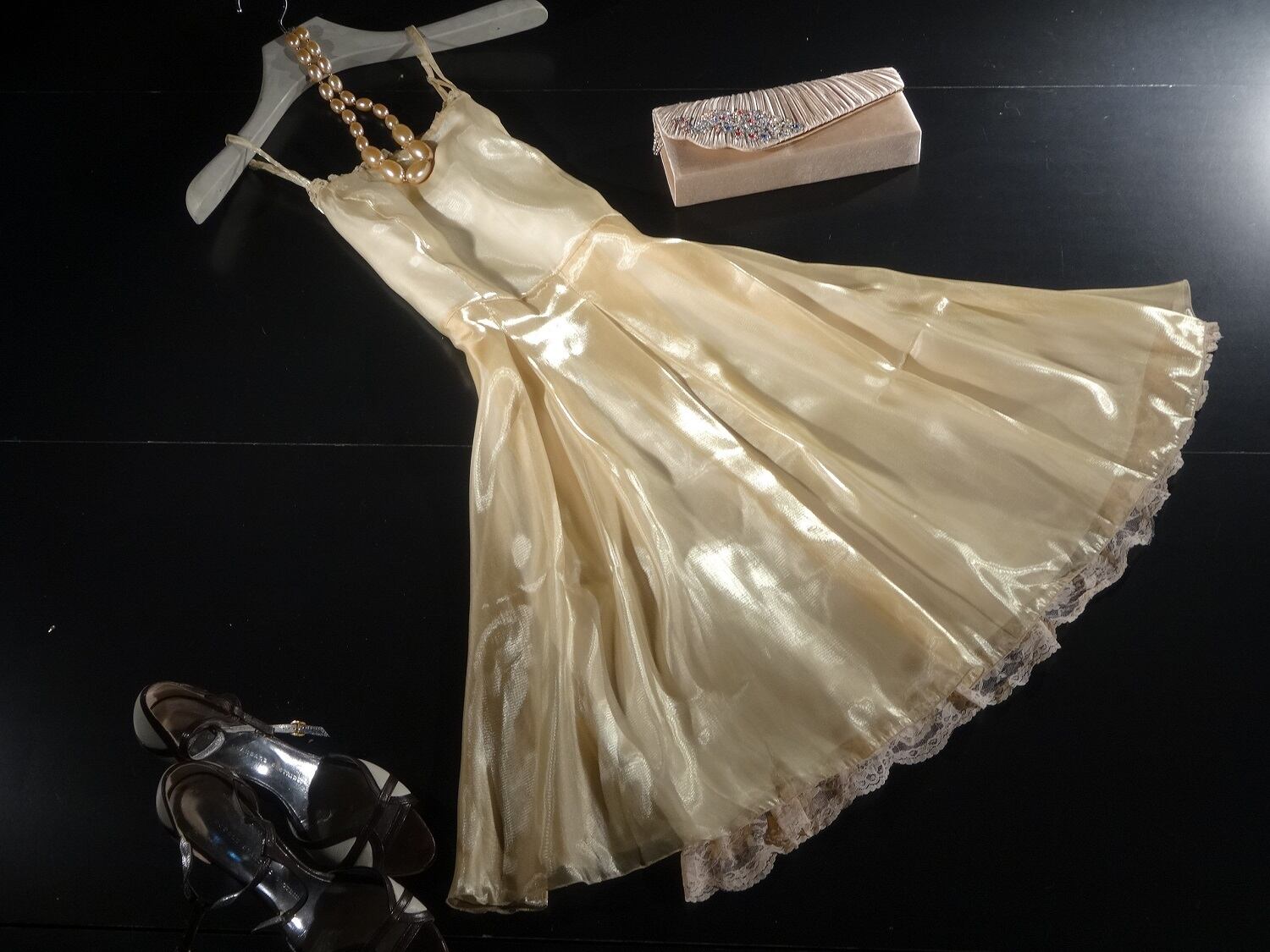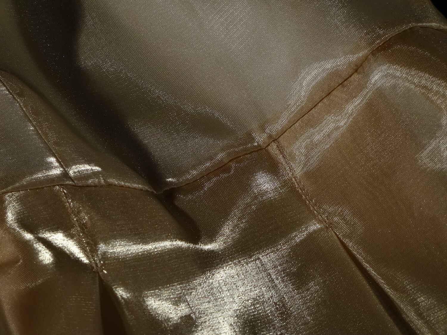 光沢感あるゴ-ルド色のドレスです。動くたびにいろいろな表情を表してくれとても素敵なドレスです。裏地有。布ベルト付。左サイドファスナ-あり。
