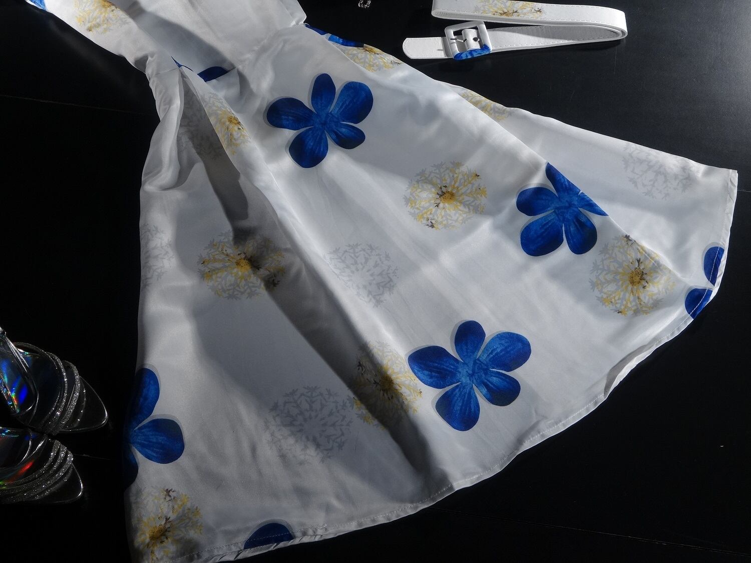 ブル-の大きな花柄がとてもゴ-ジャスで涼しげなノ-スリ-ブワンピ-スです。背中ファスナー有。ベルト付。