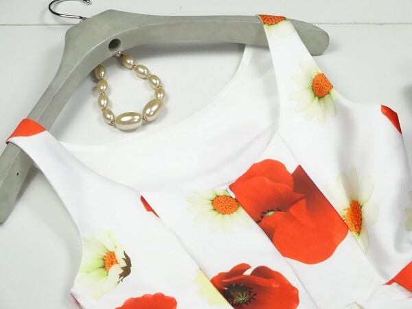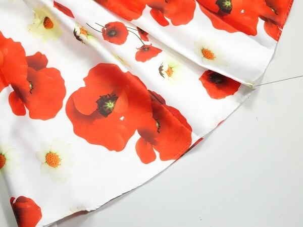 赤の大きな花柄がとてもゴ-ジャスで涼しげなノ-スリ-ブワンピ-スです。背中ファスナー有。ベルト付。