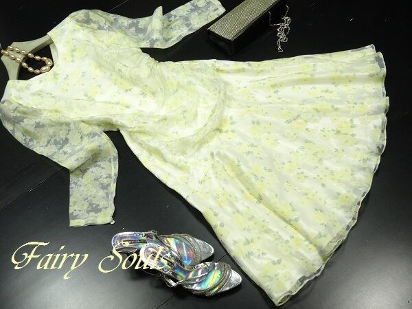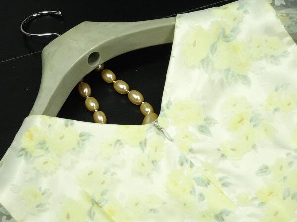 花柄オーガンジーのワンピース。やさしいレモンイエローの下地の上に花柄をプリントしたオーガンジーを重ねています。前身ごろは丸襟、背中側はV字カットで変化を持たせた、袖のほんのり肌見せ透け感がエレガントで魅力的な一着です。結婚式や謝恩会などに。背中ファスナー有。裏地有。