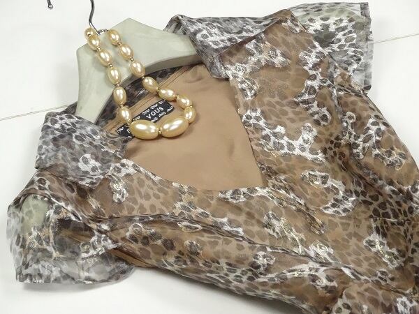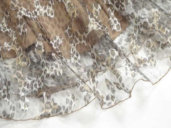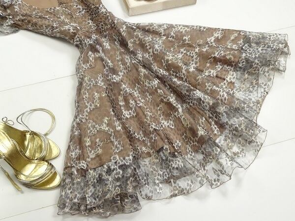 大人テイストレオパード柄シフォンのワンピース。襟もとは上半分がカラーで、下半分はカラーなしのV字カット仕立て。艶やかなオーガンジー生地にひょう柄を大胆にプリント。光を受けてきらきら輝き、華やかさとセクシーさをあわせもった魅力的なデザイン。しなやかな生地が、動くたびにひらひらと大きな花びらが舞うように美しく揺れ、足元を美しく見せてくれます。左脇ファスナー。裏地付。