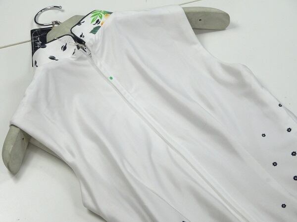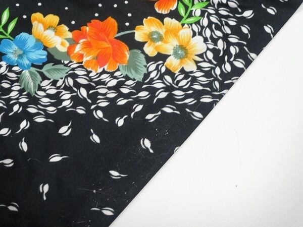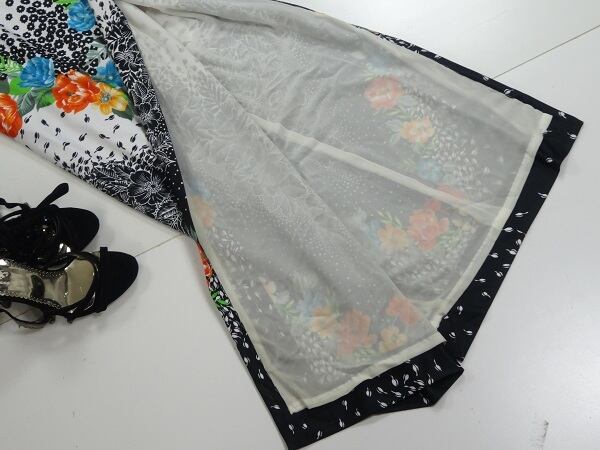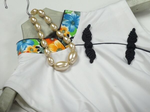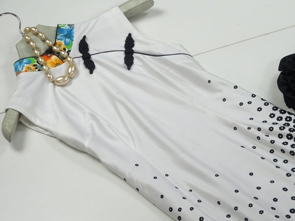 日本製の花柄が鮮やかなチャイナドレスです。生地の特性上、伸縮性はあまりなく、体にフィットしたデザイン。サイドのスリットは、肩から約70cm、裾から約75cmの位置で、サイドについている黒のリボン飾りから下がスリットになります。背中ファスナー。裏地付。