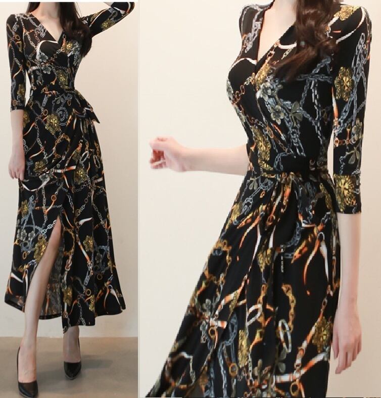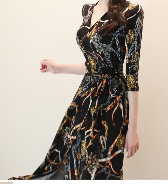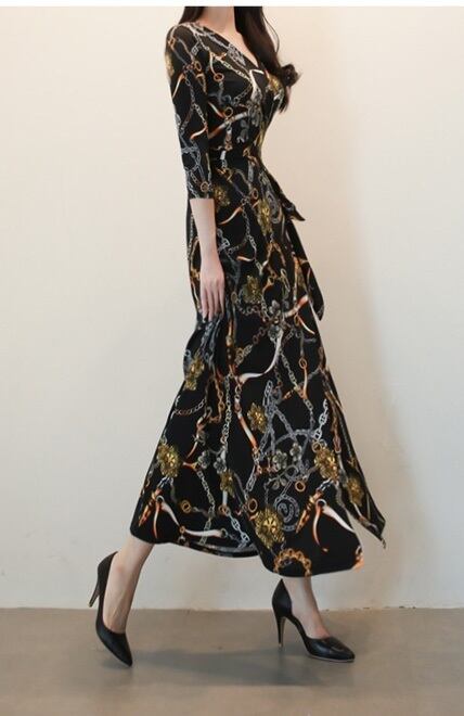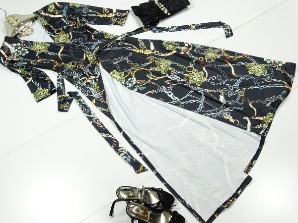 ガウン風巻きスカートのワンピ-ス。伸縮性のあるジャージ素材のプリン生地をガウン風に着用いただくデザイン。前身ごろを左右に開き、片方のウエストリボンをもう片方の開いているリボン通し穴に通し、後ろまたは前で結びます。リボン結びで留めているだけなので、動くと足があらわになりますので、気になる方はインナー着用をおすすめします。裏地なし。ファスナ-なし。ウエストリボンは縫い付けタイプ。