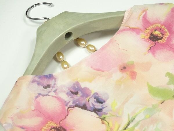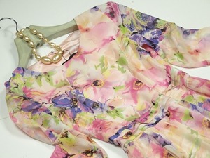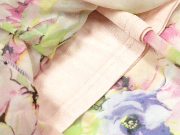 フェミニンなフリルのワンピ-ス。ピンク地にプリントされた花柄が、やさいいパステル画を思わせるフェミニンな色合い。片側の裾には裾に向かって斜めにフリルをあしらい優しさがアップ。ちょっとおしゃれな普段着としても、また結婚式の二次会などフォーマルなシーンにもあうデザインです。裏地有。左脇ファスナ-有。
