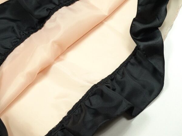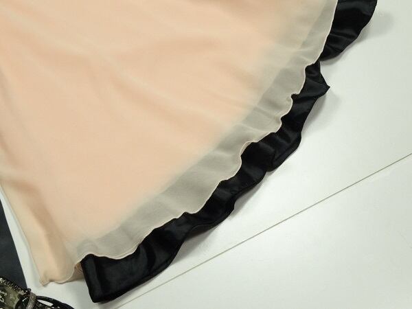 サテンのウエストリボン付キャミワンピース。背中側はゴム仕様で伸縮性があり、やさしいピンクのシフォンに裾に黒のサテンを切り返しであしらった魅力的なデザイン。取り外し可能な黒地のサテンのウエストリボンがアクセントになっています。どんなシーンにも重宝してくれる一着です。左脇下ファスナー。裏地あり。ウエストリボン付き。