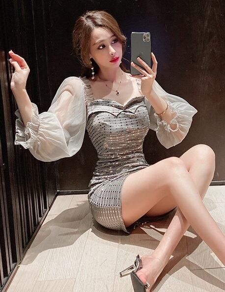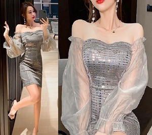 袖チュールにスパンコール飾りのワンピース。全体にスパンコールをあしらった華やかなデザイン。袖はチュ-ルが使用され透け感が女性らしく又ふんわりしているので腕を自由に動かせます。パーティやイベント、結婚式など、様々なシーンで、気品のある印象を与えてくれる一枚です。背中ファスナ-有。裏地なし。