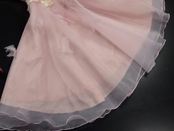 肩から胸元にかけては花模様のレース仕様。つややかなチュール地には蝶々のモチーフがあしらわれた清楚で上品なデザインです。パールのアクセサリでエレガントに。ファーを組み合わせてゴージャスな雰囲気に・・・と、さまざまなコーディネートを楽しんで頂けます。そのままでも、パーティや結婚式の二次会、お呼ばれにと、色々なシーンに活躍してくれる一着です。左側ファスナーあり。裏地付。