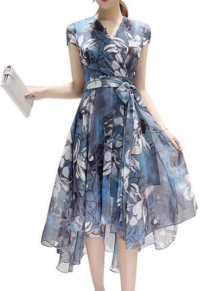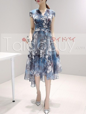 大きな花模様がプリントされたシックなワンピース。裾の後部分が長くなっている不規則な丈の品の良いセクシー感をかもしだしているエレガントな一着です。ウエストを共布のベルトリボンでキュッと絞るデザイン。シックでやさしくエレガントな一着です。裏地有り。背中ファスナー有。布ベルト付。