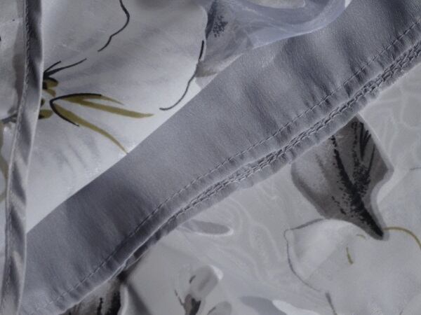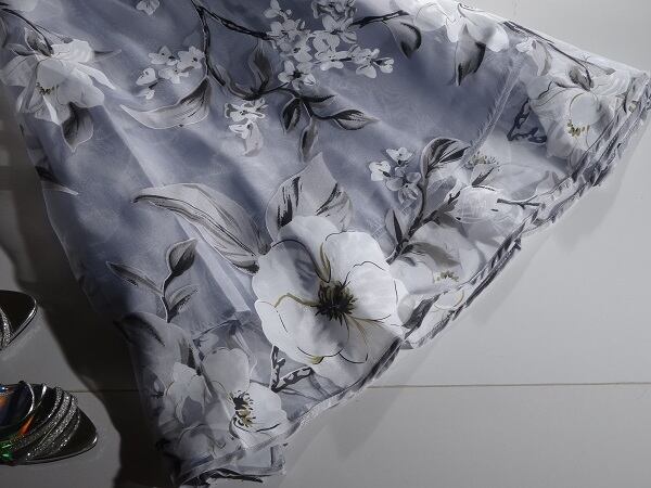 シックなオーガンジーのワンピース。落ち着いたグレーの地にモノトーンの花模様がバランスよくプリントされています。デコルテライン、袖のほんのり肌見せ透け感がエレガントで魅力的な一着です。結婚式や謝恩会などに。背中ファスナー有。裏地あり。