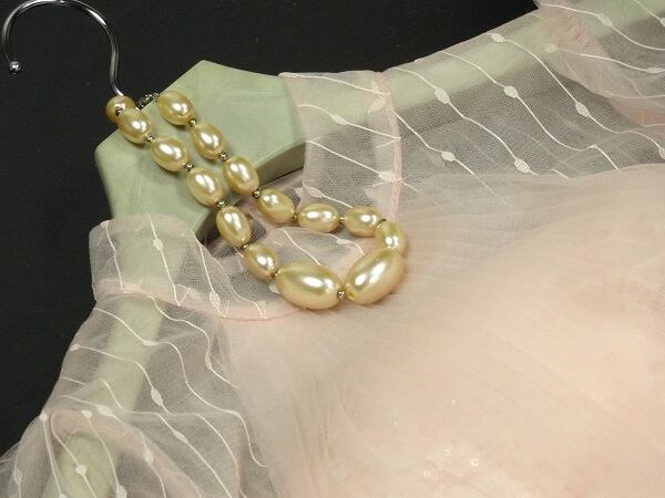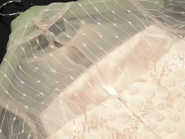ビーズ飾りチュールの長袖ドレス。やさしいピンクのサテン地の上に、ビーズとドットの飾りが施されたチュールを重ねた、デザイン性のあるスタイルがとても魅力的な一着。胸元と袖は透け感があり、ほんのり見える肌が上品。うなじから背中の中央辺りまでスリットが入り、その下からファスナーになっています。裏地付き。背中ファスナ-有。胸パット付き。チュールは2重。表示は2XLですが、少し細身です。キュートで華やかなデザインです。