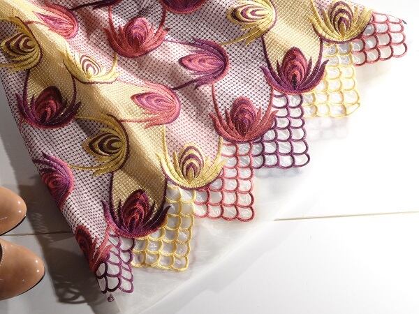 チュールレース地の上に、ボルドーカラーと黄色で花模様が大胆に刺繍されたワンピース。シンプルなスタイルですが、立体刺繍が緻密に配置され、光沢のある下地がチュールの下からほんのり見えて、奥行きのある、高級感あるデザインになっています。背中ファスナー。裏地あり。