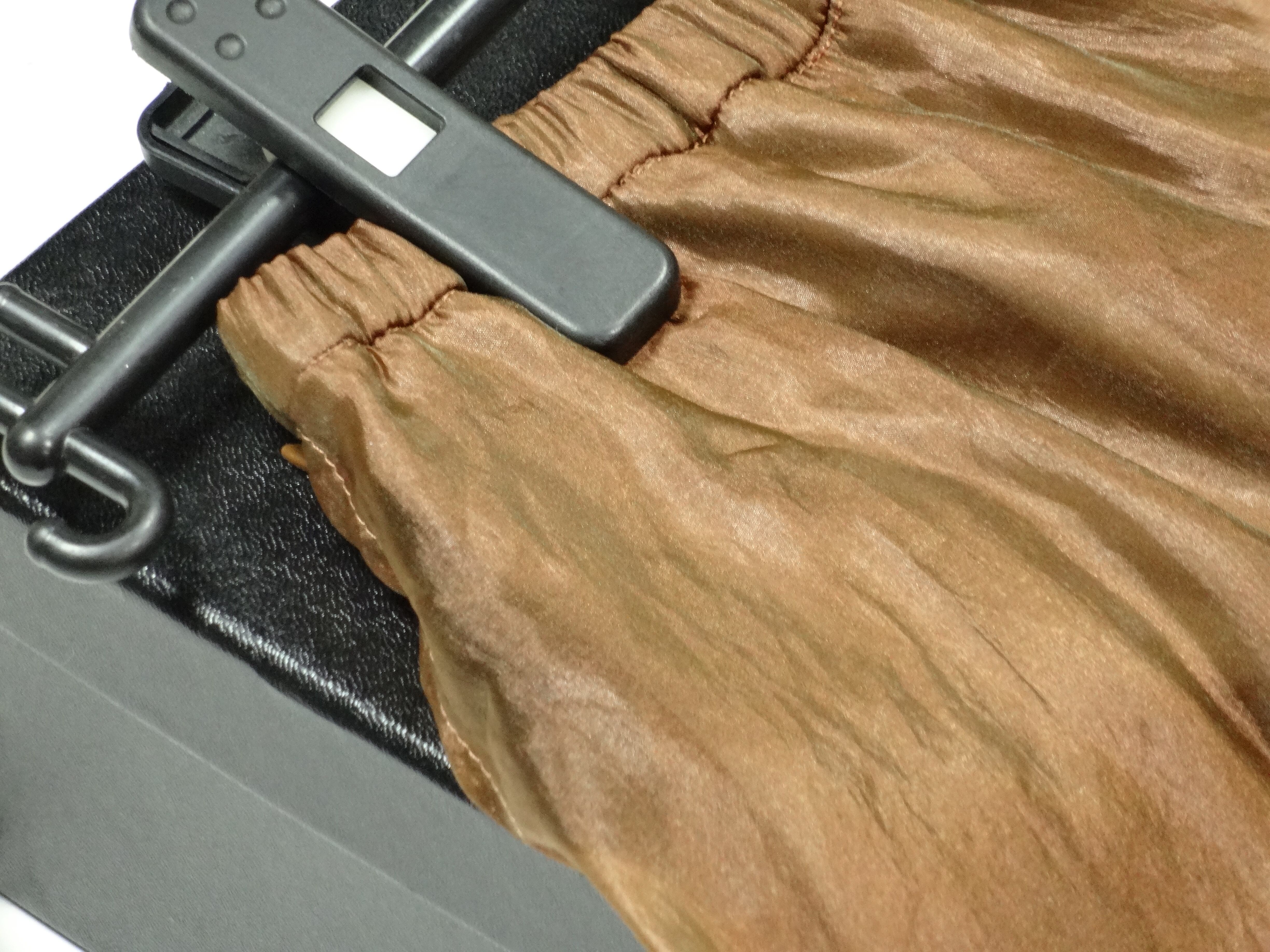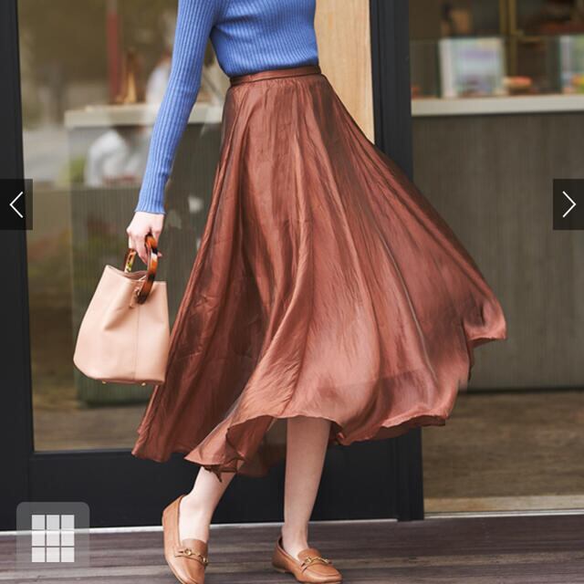 柔らかい生地でとてもエレガントなマキシ丈スカ-トです。スカート部は生地がたっぷり使用されていますので歩くたびの揺れ感がとても女性らしくまるで女優になった気分にさせてくれます。光沢感が大人のエレガンスさを感じさせてくれるシンプルデザインです。左サイドファスナ-有。裏地あり。