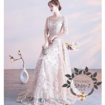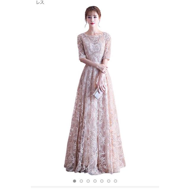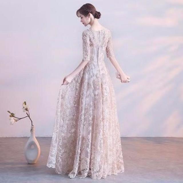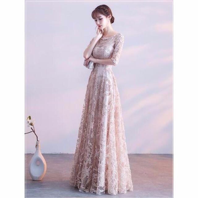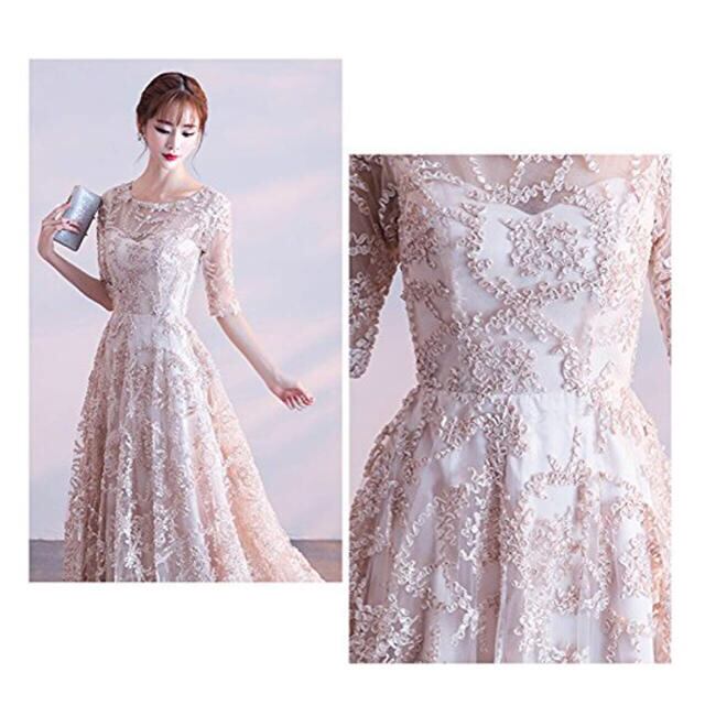 リボン刺繍のパーティ-ロングドレス。袖やデコルテの透け感がとても美しく大人の女性を醸し出してくれるエレガントなデザイン。全体にゴールドの立体刺繍が施されデザイン性のあるスタイルがとても魅力的な一着です。全体的に優しい感じに仕上げられています。背中ファスナ-有。胸パット付き。