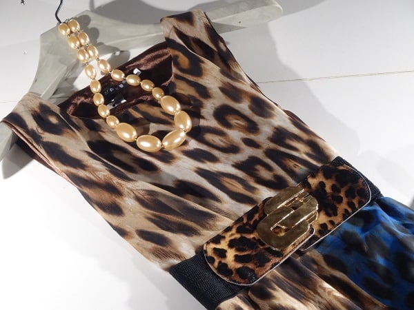 レオパード柄シフォンロング丈ワンピース。トップスからウエスト裾にかけてレオパード柄がグラデーションでプリントされた目を引くデザイン。ウエストは幅広の合皮ベルトでアクセントを。しなやかなシフォン生地が風に揺れ、女性らしいシルエットを作り出しています。ファスナーなしのかぶるタイプ。ベルト付。裏地付。