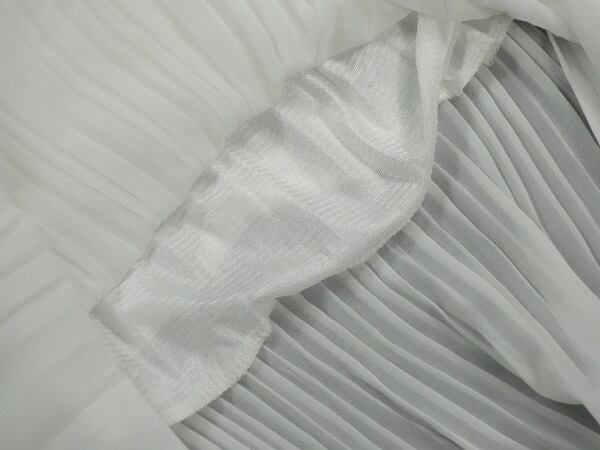 マキシ丈ピュアホワイトプリーツスカートのワンピース。トップスはゆるやかなラウンドネックにしなやかなシフォンが2段ふんわりとかぶさったデザイン。ウエストから裾にかけて繊細なグラデーションプリーツになっています。動くたびに脚もとを美しいシルエットがうまれる品の良い一着。リゾート、パーティ、デートなどさまざまなシーンで活躍してくれます。ウエストゴム仕様で伸縮性有。ファスナーなしのかぶるタイプ。裏地付。