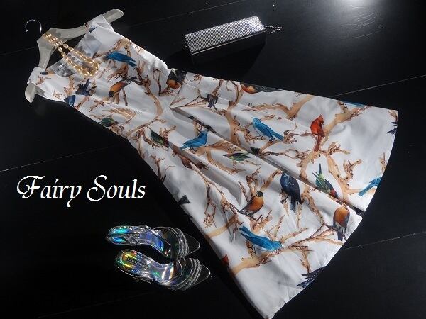 ポリコットンのしっかりした生地に、色とりどりの鳥たちがプリントされた華やかなワンピース。襟繰りはスクエアに中央でV字カットをほどこしアクセントに。スカート部分は、裾にゆるやかに広がるフレアタイプ。ゆるすぎず、派手過ぎず、品の良い可愛いデザインです。背中ファスナー。裏地あり。