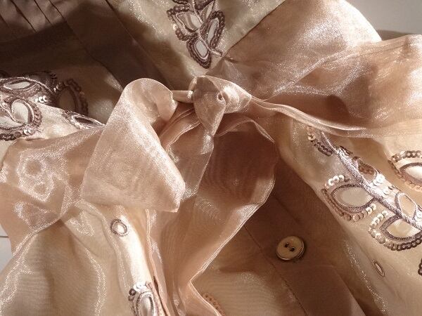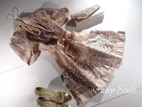 切込み刺繍のスプリングコートワンピース。落ち着いたモーブピンクのオーガンジー生地に刺繍をあしらい、切込みから下地のベージュが程よく見えて色のアクセントになっています。立襟と胸元の細いタックがエレガントな印象に。お呼ばれ、デート、イベントなど様々なシーンに活躍してくれる一着です。前ボタン留め。共布ウエストリボンベルト付。裏地あり。