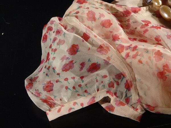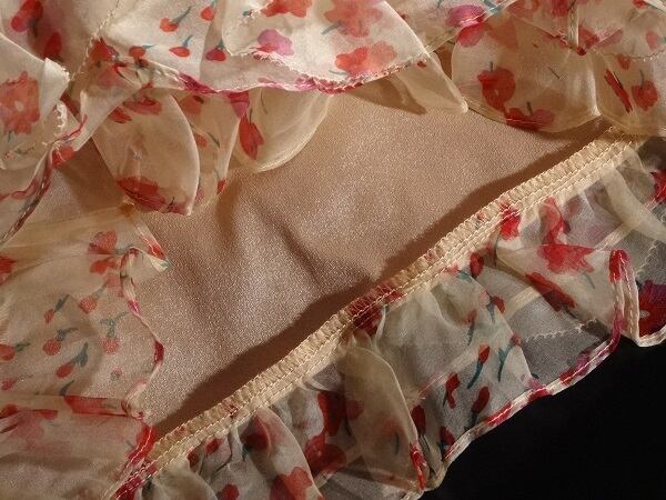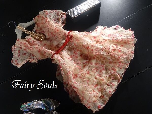 ベージュピンク地の上に、小花がプリントされたオーガンジーをかぶせたワンピース。ゆるやかなラウンドネックと、透け感のあるぷっくりとした袖が優しい印象に。スカート部分はオーガンジーのフリルをふんだんにあしらい、キュートで豪華なデザインになっています。赤のベルトをキュッとしめて可愛らしさをアップ。ベルト付。サイドファスナー。裏地あり。
